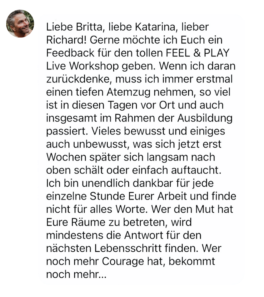 „Ich fand Euren Live Workshop in Berlin sensationell. Die 2 Tage waren gefüllt mit Übungen, die aus meiner Sicht eigentlich in jeden Paaralltag gehören. Ich habe mich sehr gut aufgehoben und ja auch geborgen und sicher dabei gefühlt. Und ich habe alle Übungen so intensiv und detailliert erleben dürfen, sodass es mir inzwischen ein leichtes ist, sie in mein Liebesleben zu integrieren. Ich bin begeistert! Tausend Dank“ Tom, 49