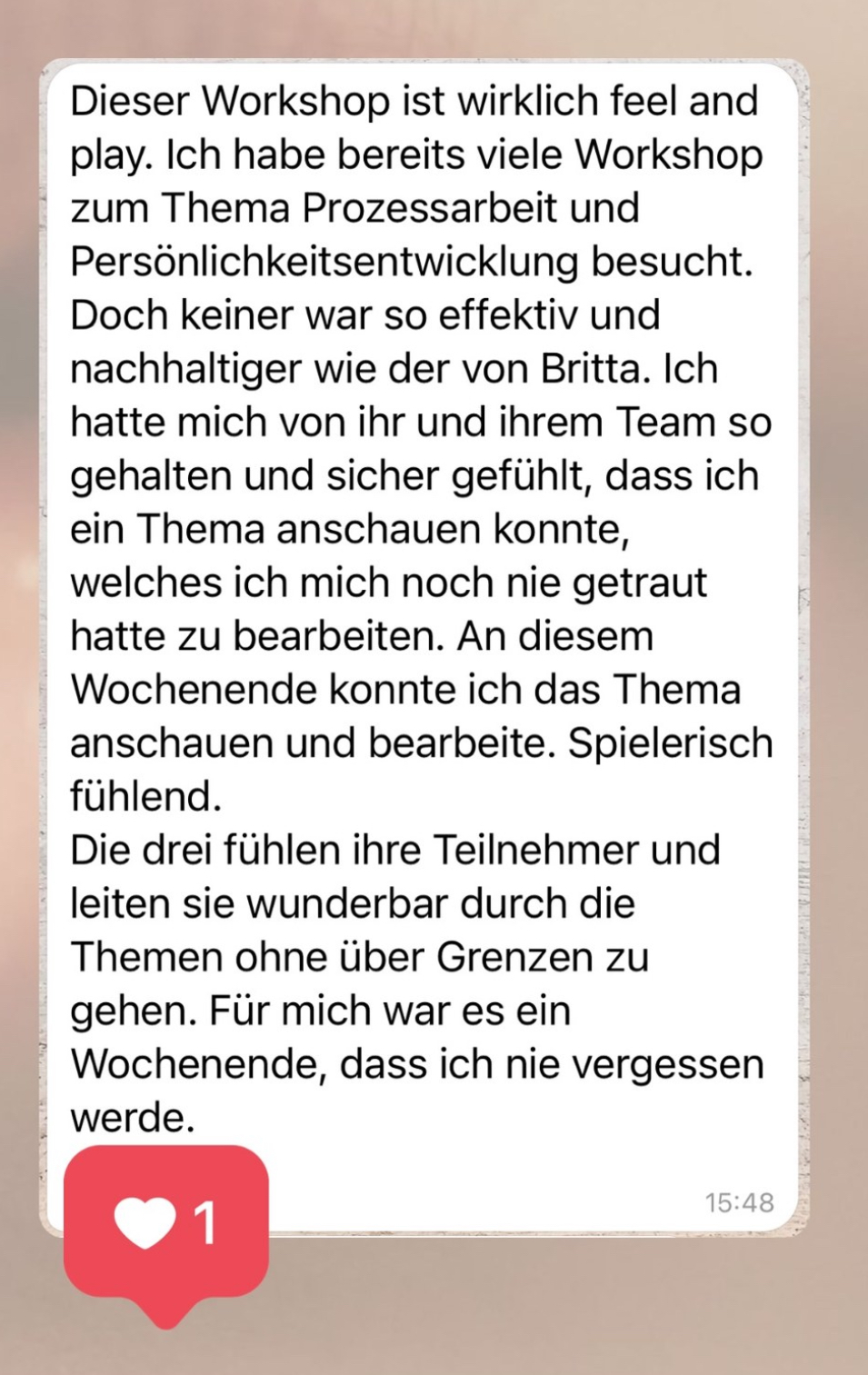 Ich fand den Workshop wirklich total bewegend. Für mich hat das Wochenende nochmal total viel los getreten und innere Prozesse, die in mir brodelten, mehr ans Licht gebracht. Und Sachen, die ich vorher eher auf der theoretischen Ebene verstanden habe, habe ich durch die Übungen von dir nochmal so richtig „verkörpert“ verstanden.